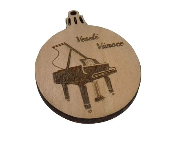 Drevená vianočná banka vyrezaná z preglejky s hudobným motívom - klavír. Materiál: topoľ preglejka o hrúbke 3 mm. Veľkosť (priemer banky): 6,4 cm. Farba: prírodné svetlé drevo. Motív gravírovaný laserom. Vyrobené v Českej republike.