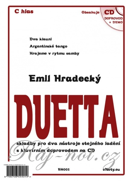 Tento titul Vám ponúka tri veľmi príjemné, osviežujúce a rytmické skladby Emila Hradeckého napísané pre dva nástroje rovnakého ladenia s klavírnym sprievodom. Súčasťou zošita je odkaz na stiahnutie nahrávok v niekoľkých prevedeniach - v demo verzii, bez prvého hlasu, bez druhého hlasu a iba klavírny sprievod. Rýchlejšie skladby (Dva klauni a Hráme v rytme samby) sú nahrané aj v miernejšom tempe pre ľahší nácvik alebo predvedenie skladby v pomalšom tempe. Dueta je možné cvičiť a hrať aj sólovo s nahrávkou prvého alebo druhého hlasu. Part pre klavírny sprievod je na stiahnutie online vo formáte PDF. V sérii DUETTA boli vydané zošity pre nástroje v ladení C, Bb a Eb. Všetky tri zošity pre jednotlivé ladenia je možné medzi sebou vzájomne kombinovať a DUETTA sú hrateľné v kombinácii akýchkoľvek dvoch nástrojov uvedených ladení. Emil Hradecký (*1953) je významný český hudobný skladateľ, aranžér a učiteľ hry na klavíri, ktorý sa vo svojej tvorbe často inšpiruje tanečnou hudbou a jazzom. Tvorba Emila Hradeckého je však veľmi rozsiahla a jeho „nejazzové“ skladby sú veľmi melodické, príjemné na počúvanie a obľúbené medzi učiteľmi a ich žiakmi.