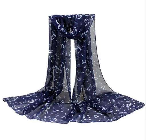 Tento krásny šál v tmavo modrej farbe je skvelým doplnkom oblečenia pre chladné a daždivé dni. Vďaka nej budete chránení pred prípadným chrapotom a zároveň budete vyzerať štýlovo. Šál je zdobený notovou osnovou, ktorá jej dodáva hudobný nádych. Keď ju budete mať na krku, budete vyzerať ako časť živého koncertu. Určite nenechajte tento šál ujsť, ak milujete hudbu a radi si doprajete kúsok luxusu v každodennom živote. Veľkosť 160x50 cm