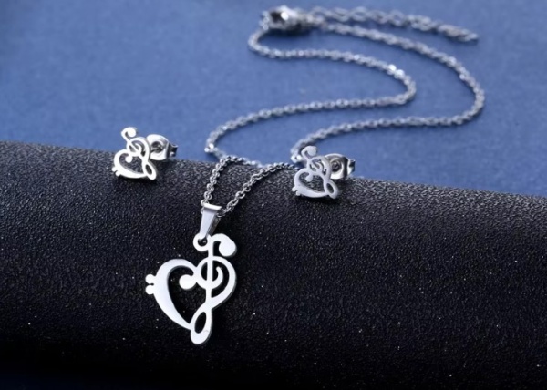 Súprava náušníc a náhrdelníka v tvare srdca obsahuje elegantné motívy husľového a basového kľúča. Táto nádherná kombinácia symbolizuje lásku k hudbe a umelecký prístup ku každodennému životu. Náušnice zdobia jemné detaily srdiečok, zatiaľ čo náhrdelník tvorí harmonickú kompozíciu oboch kľúčov prepojených do jedinečného dizajnu. Diaľka náhrdelníka je 45 cm.